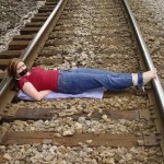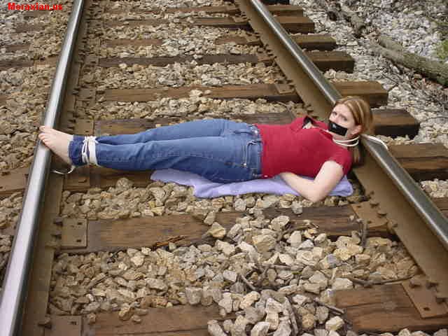 This situation however was worse, much worse. At any moment, a train could come down these tracks and smash her like a bug on a windshield. She screamed again and again into the tape, but to no avail. No one would hear her in these woods. She tried to struggle again to rid herself of the ropes around her wrists to no avail. The towel provided to her offered little comfort on the rocks, rails and wooden ties. She again tested the rope around her neck and found it cruelly effective. If she fought that rope instead, she'd be dead long before the train came through. The rope around her ankles also had no give. She kept fighting the ropes though...she had no choice to do otherwise... |